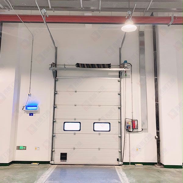 出出货口工业提升门采用4公分厚防夹手门板,中间是高密度聚氨酯发泡,整个门体是由一块块钢制发泡门板连接而成的,门板连接处采用冷桥设计,防止内部温度流失,具有高保温。四周分别有密封橡胶,门板与门板的连接也带有橡胶,防止外部灰尘异物进入,保证内部环境的洁净度。
