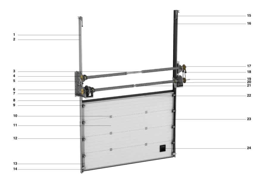 安全装置包括:扭簧防断裂保护装置和钢丝绳防断保护装置,防止门体意外坠落。