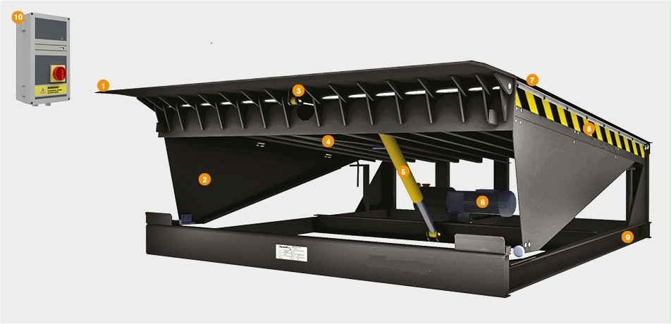 不同的装卸车辆与月台之间不可避免的会存在高度差,给装卸货带来困难。液压装卸货平台就像是车辆与月台之间的一个桥梁,弥补了两者之间的高度差,使叉车在车厢与月台之间自由出入,如履平地。液压装卸货平台安装在月台预留的坑口中,台面结构稳定,有很好的抗偏能力,即使叉车上的货物重心有一定偏差,也不会影响平台的正常工作。台面和唇板分别由两个主油缸和一个唇板油缸带动,支撑稳定,易于操作。更重要的是,安全性极佳——每个主油缸上都装有能够紧急制动的节流阀。这一点非常重要,有时因为一些原因,叉车和货物还在平台上,但载货车辆却突然驶离,失去车厢支撑的台面绝不会倾倒坠落,而是在主油缸及节流阀的作用下稳稳地托住叉车及货物,确保人员和货物安全。