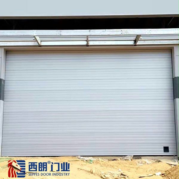 该客户使用的是钢制电动提升门,宽度相对比较大,为了更好的防风抗压具备多个抗风背筋,保证基本6-8级的抗风性能;门板的颜色改成银灰色,更显时尚大气,更符合客户的气场;由于新建厂房上方空间有限,不能直升上去,选择翻板转弯提升,上升速度在0.25-0.35m/s。